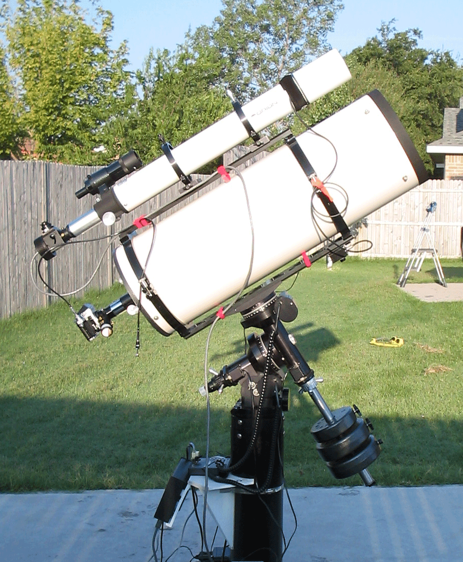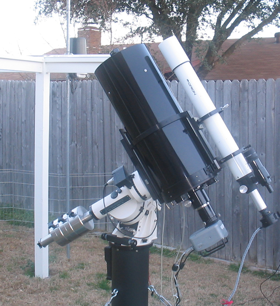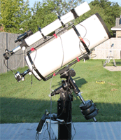 Here is my latest work in progress. This is a 253mm f/15 Classical Cassegrain by Star Instruments. This is shown in my backyard set-up on the permanent G-11. The OTA is secured using two Losmandy DC-14's sandwiching a pair of Parallax Rings. This provides a relatively stable mounting that can accept my 10" f/4 or 10" f/6 as well. Mounted on the upper Dovetail is the aforementioned Orion guidescope. The set-up as pictured is set with a primary to secondary spacing of 29 3/8 inches and 12 inches of rear focus available. Future enhancements will be addition of a rear mounted cooling fan and an Astrophysics 2.7 inch focuser.