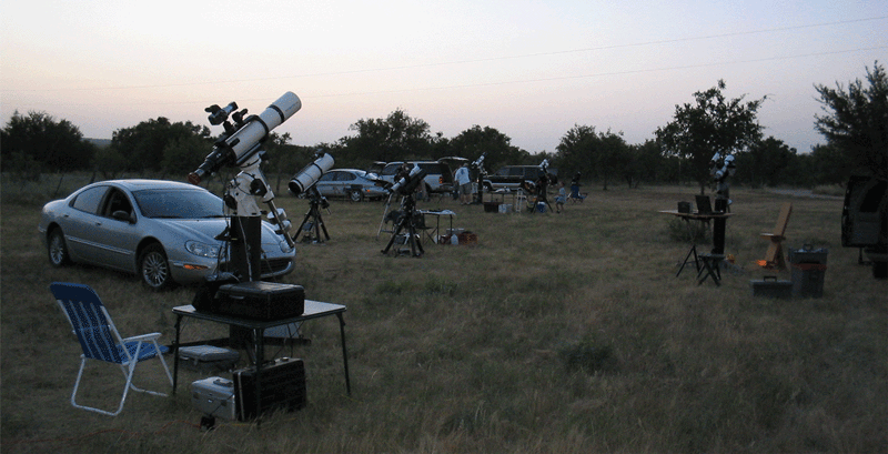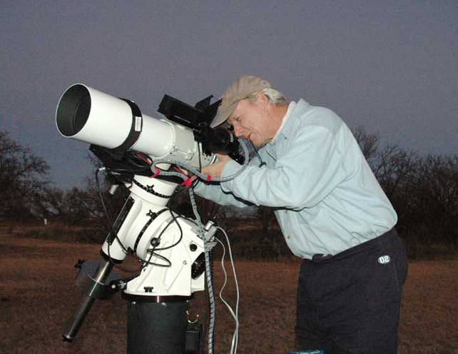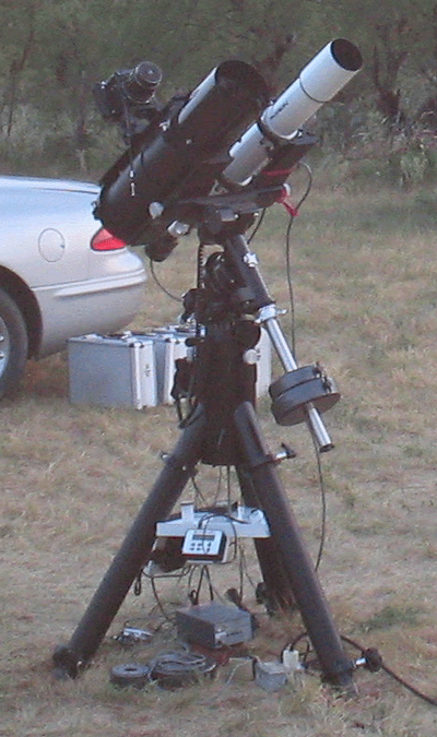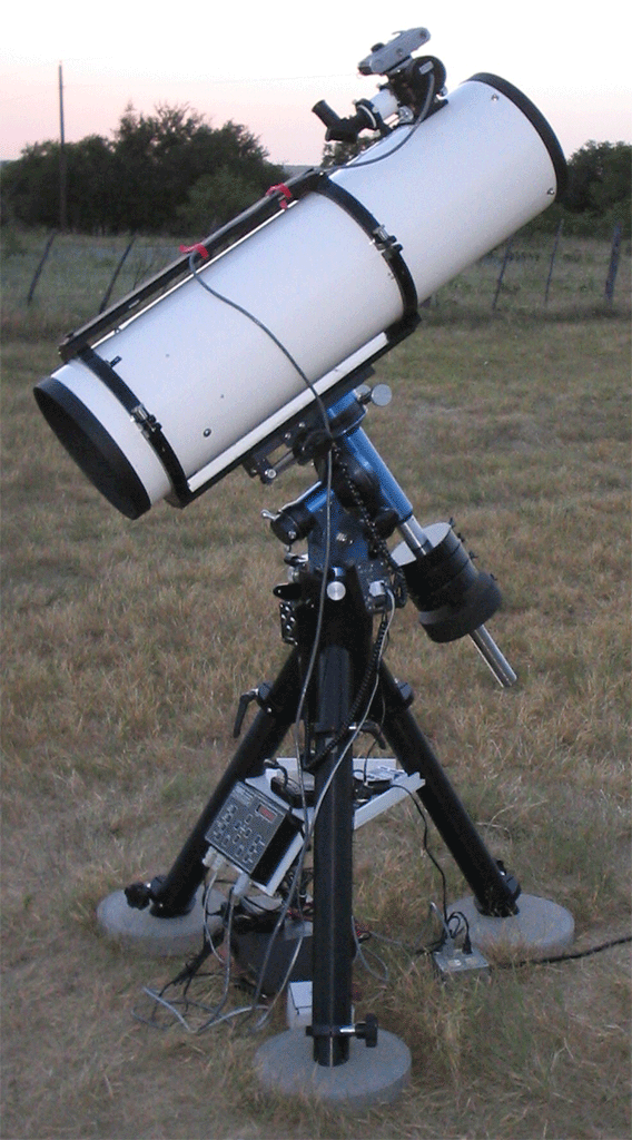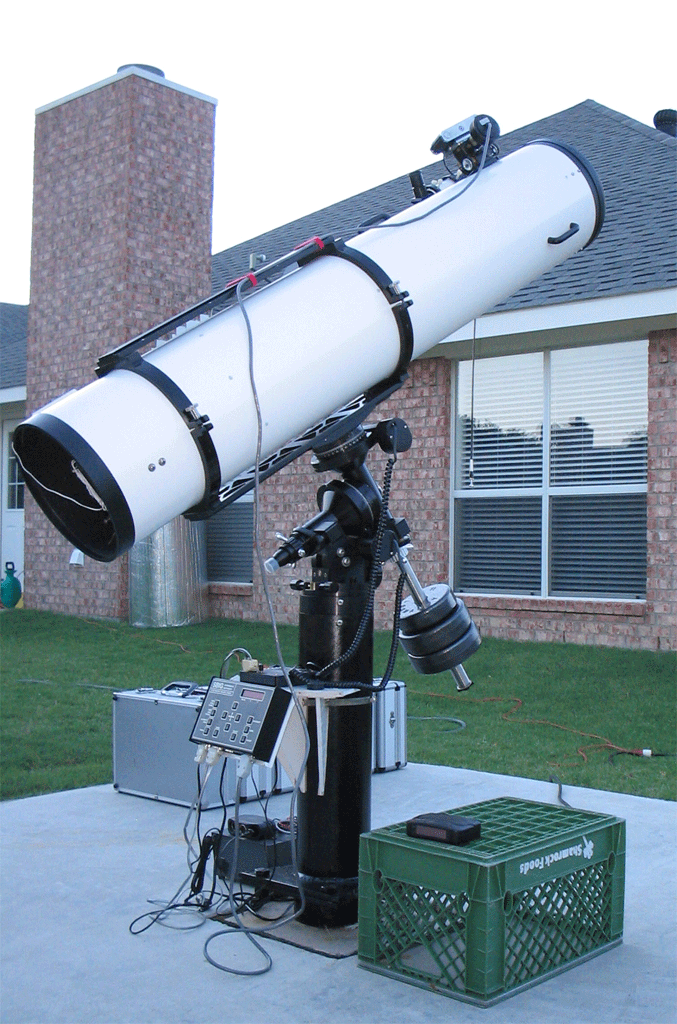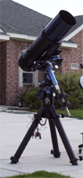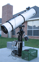 This is the bigger brother to the Celestron 5.5 inch Schmidt Camera. It is 8 Inch and operates at f/1.5. This camera used to be owned by Hans Vehrenberg and has one of the rare Vehrenberg Medium Format Film Holders. With this film holder installed this camera will image a 10 degree circular section of sky. This instrument is mounted, like the others, in a cage constructed of Losmandy Dovetails and Parallax Rings. I have added a Meade Metal Dew Shield. this is shown here on the GM-100. Future changes needed here are a bit of collimation, always fun at f/1.5 and installation of a nitrogen purge to help combat the humid Texas conditions which can spoil Hypered Tech Pan very quickly.